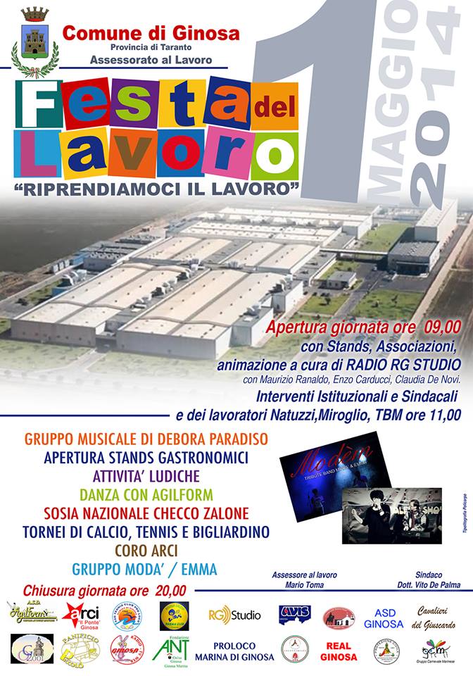 Mercoledì 30 aprile 2014, alle ore 10.30, presso la Sala Consiliare della Città di Ginosa, si terrà una conferenza stampa finalizzata alla presentazione della giornata della Festa del Lavoro che si svolgerà il primo maggio in Ginosa, presso il vasto complesso industriale comunale di contrada Girifalco.L'iniziativa si pone nell'ambito delle numerose attività che l'Amministrazione Comunale di Ginosa ha ideato e realizzato per tenere viva l'attenzione nazionale sulla disponibilità del vasto complesso industriale comunale di contrada Girifalco, al fine di un nuovo insediamento produttivo atto alla realizzazione di una stabile, concreta e corposa offerta occupazionaleAlla indicata conferenza stampa parteciperanno, alla presenza delle organizzazioni sindacali e dei lavoratori interessati alla relativa mobilità occupazionale, il Sindaco della Città di Ginosa, dott. Vito De Palma e l'Assessore al Lavoro, Mario Toma.