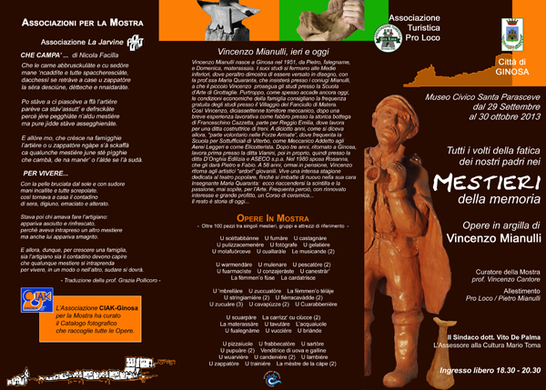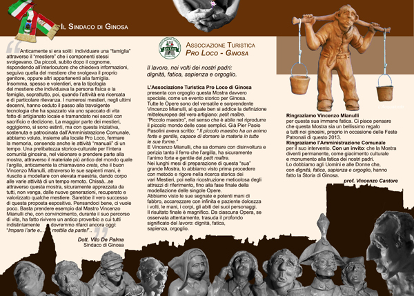 Una prelibatezza storico - culturale per l'intera comunità ginosina, nel visionare e prendere parte alla mostra, attraverso il materiale più antico del mondo quale l'argilla, anticamente la chiamavamo creta, che il buon Vincenzo Mianulli, attraverso le sue sapienti mani, è riuscito a modellare con elevata maestrìa, dando corpo le varie attività di un tempo remoto.