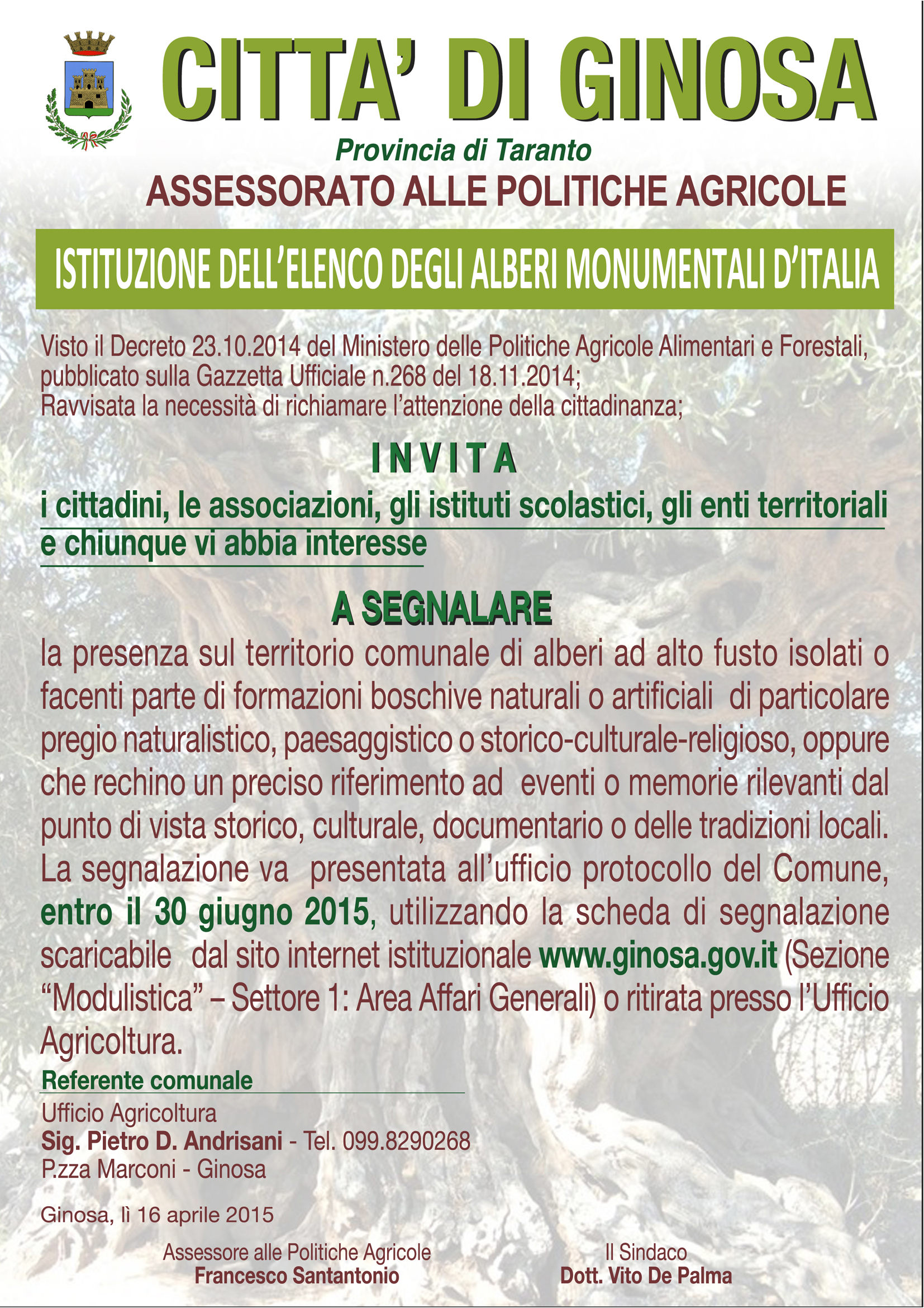 La segnalazione va presenta all'ufficio protocollo del Comune, entro il 30 giugno 2015, utilizzando la scheda di segnalazione scaricabile dal sito internet istituzionale www.ginosa.gov.it (Sezione "modulistica" - 1 Settore: Area Affari Generali)