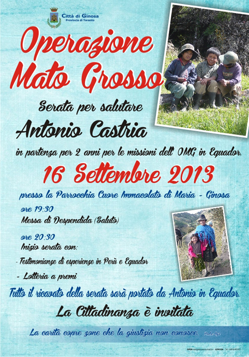 Lunedì 16 settembre 2013, alle ore 20, presso la Parrocchia "Cuore Immacolato" di Ginosa iniziativa di solidarietà per il concittadino Antonio Castria, missionario volontario, in partenza per le popolazioni dell'Ecuador tramite l'Operazione Mato Grosso.