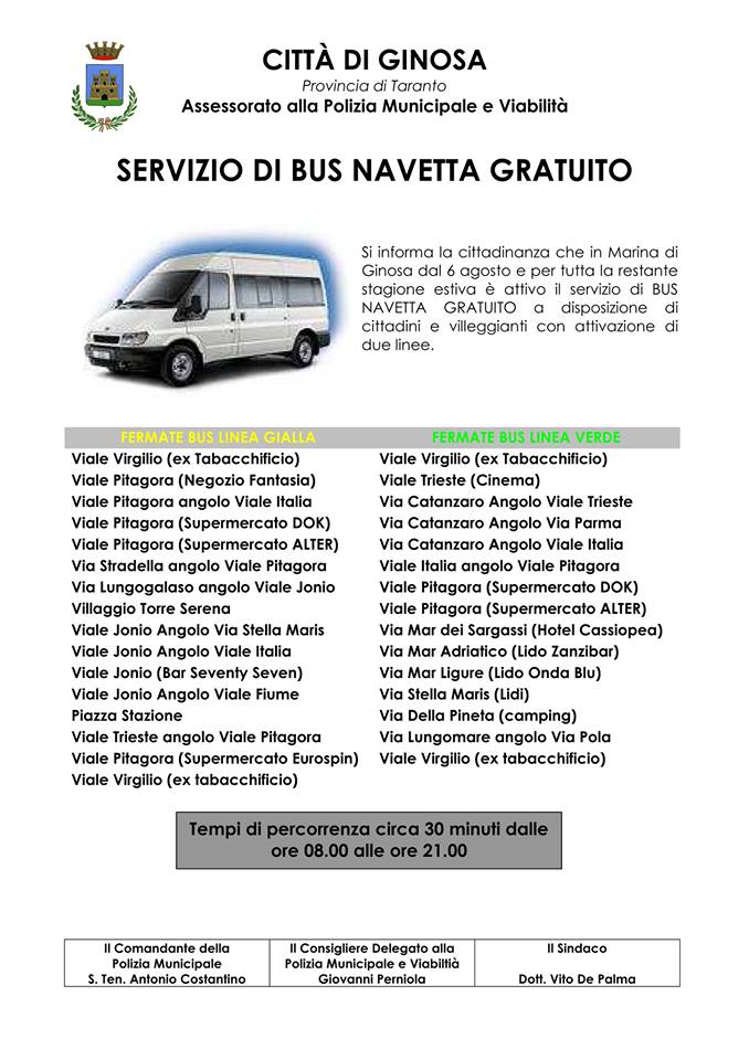 Descrizione Si informa la cittadinanza che in Marina di Ginosa da oggi martedi 6 agosto 2013 e per tutta la restante stagione estiva è attivo il servizio di BUS NAVETTA GRATUITO a disposizione di cittadini e villeggianti con attivazione di due linee