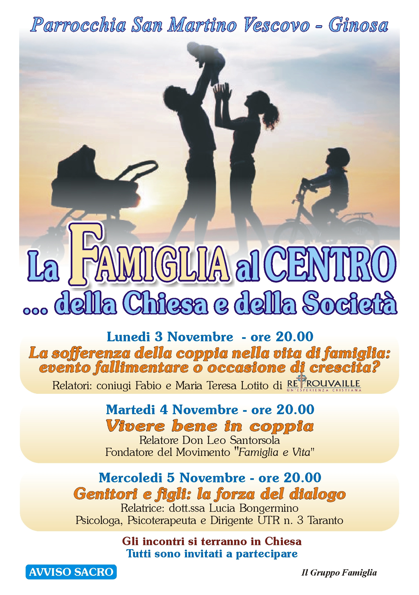 Descrizione Tre giornate di incontro e dibattito, alle ore 20,00, presso la Parrocchia San Martino. Da domani e fino a mercoledì 5 novembre la "famiglia" al centro della società